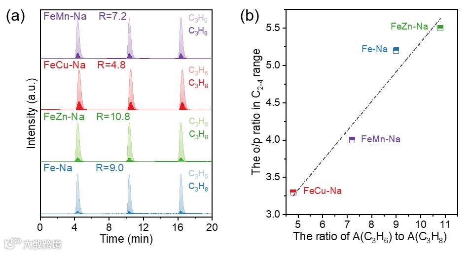 为探究上述催化剂性能差异性的原因,作者利用丙烯脉冲实验对催化剂上丙烯的二次吸附加氢能力进行了探究。如图2a, R值(C3H6与C3H8的积分面积之比)由大到小依次为FeZn-Na (10.8) > Fe-Na (9.0) > FeMn-Na (7.2) > FeCu-Na (4.8)。其中,Zn的添加显著抑制了FeZn-Na催化剂表面上烯烃的进一步加氢,而Cu助剂则显著增强了烯烃二次加氢的能力。此外,C2-4烃类的O/P比随R值的增加而线性增加(图2b),表明R值越低催化剂表面生成的烯烃越容易发生加氢反应。