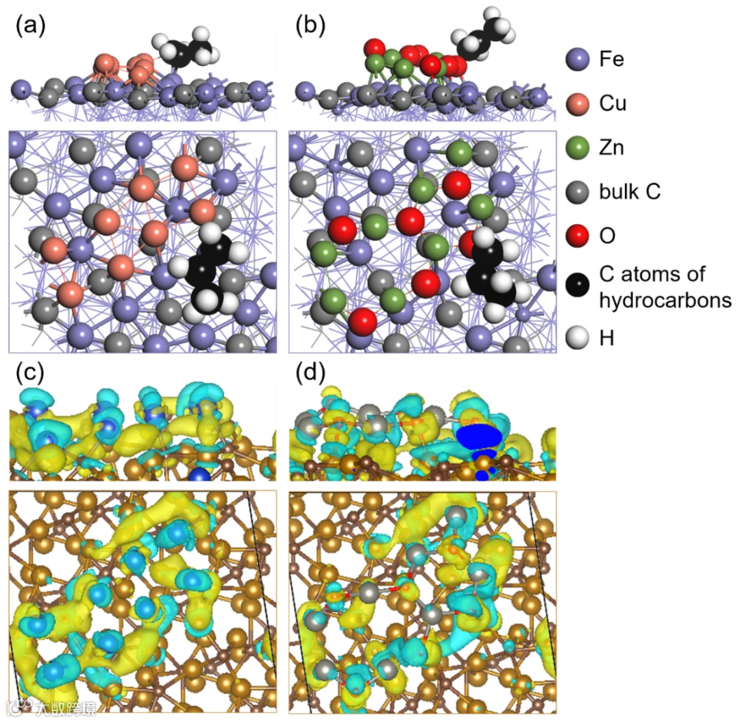图4. 丙烯在(a, c) Cu/Fe5C2(111)和(b, d) ZnO/Fe5C2(111)表面的吸附结构及差分电荷密度图