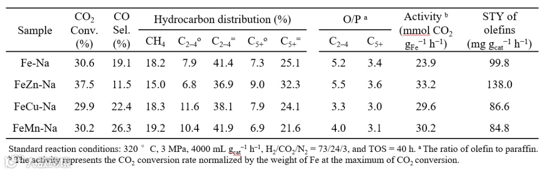 表1. 过渡金属改性铁基催化剂上的二氧化碳加氢反应性能