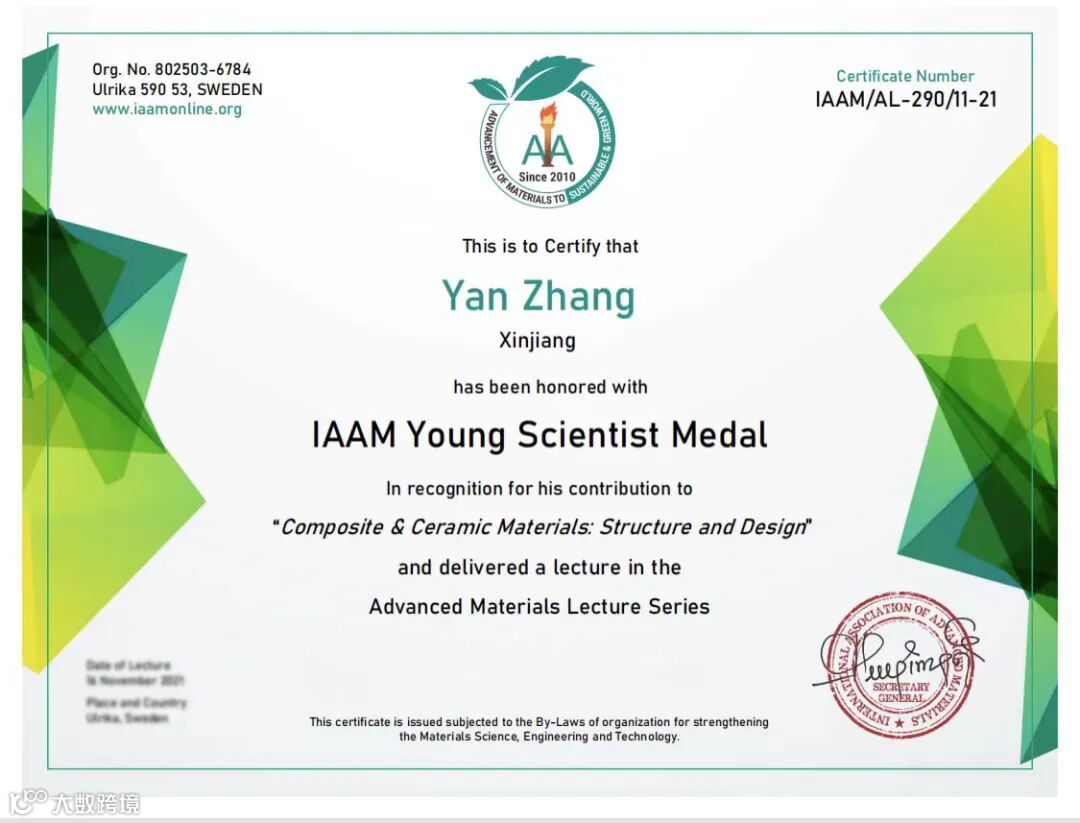 新疆大学张岩副教授获国际先进材料协会青年科学家奖(IAAM Young Scientist Medal)