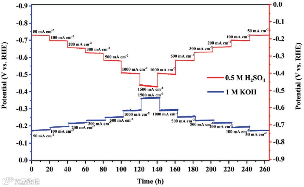 在0.5 M H2SO4和1.0 M KOH介质中,Mo2C基陶瓷电极均展现出优异的HER催化性能。在1500 mA cm−2的电流密度下,在酸性和碱性介质中的过电位分别为469 mV和360 mV,而Pt电极则需要551和592 mV。同时陶瓷电极展现出较强的高温适应性,可直接用于工业高温电解水。在酸性和碱性介质中,Mo2C基陶瓷电极均可以在多段电流密度(50-1500 mA cm−2)下稳定运行超过260 h,保持结构和催化性能的稳定。