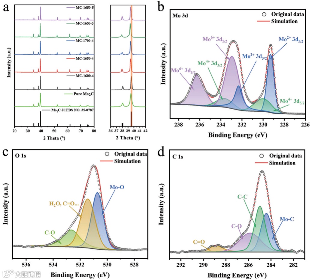 图5 Mo2C基陶瓷电极的XRD和XPS