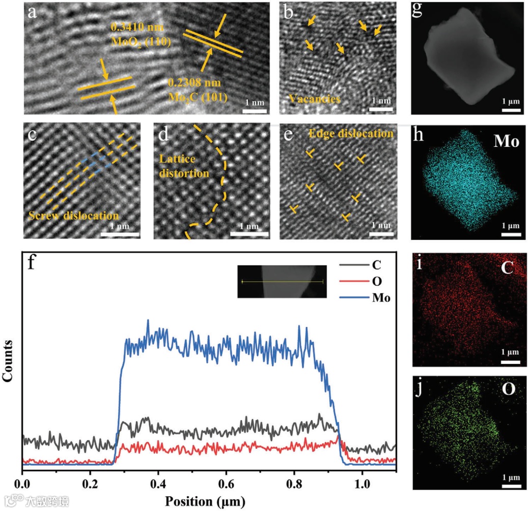 通过XRD图谱分析,发现Mo2C基陶瓷电极的衍射峰相较于标准卡片发生向左偏移,这主要是由于O进入Mo2C晶格引起的晶格膨胀导致的。HRTEM图中存在包括空穴、刃位错等在内的丰富的缺陷,以及独特的Mo2C(O)/MoO2异质结构。此外,XPS图谱中的Mo 3d结合能升高以及O 1s结合能降低,表明Mo周围电子结构发生改变,电子由Mo流向O。