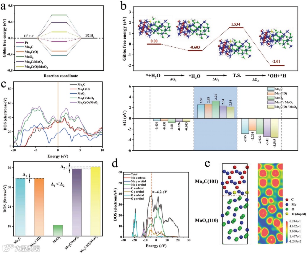 在碱性介质中,H2O的解离步骤是HER反应的限速步骤。与纯Mo2C(ΔG2= 2.57 eV)和纯MoO2 (ΔG2= 3.26 eV)相比,具有较低能垒的Mo2C/MoO2(ΔG_2= 2.34 eV)和Mo2C/MoO2 (ΔG2= 2.14 eV)加速了H2O的解离。同时,考虑到H=O在Mo2C/MoO2和Mo2C(O) /MoO2异质结构下的整个解离过程,水分子解离前后的吉布斯自由能差值小于0。因此,热力学分析也支持异质结构的形成有利于水的解离过程。