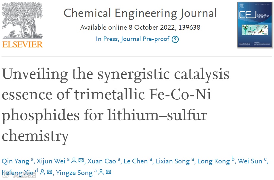 基于此,西南科技大学的宋英泽特聘教授与兰州交通大学的谢克锋副教授合作,在国际知名期刊Chemical Engineering Journal上发表题为“Unveiling the synergistic catalysis essence of trimetallic Fe-Co-Ni phosphides for lithium–sulfur chemistry”的研究论文。