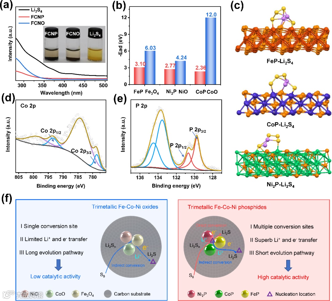 Fig. 3. (a) UV−vis absorption spectra of Li2S4 solution after adsorption on FCNPC and FCNO: the inset showing the visual Li2S4 adsorption test. (b) Adsorption energies of Li2S4 on the L2S4 on metal phosphides components. (d, e) XPS spectra of FCNP after affinity with Li2S4. (f) Schematic illustration of the “synergistic electrocatalysis”: promoting Li–S redox reactions at the trimetallic FCNP and FCNO surface.