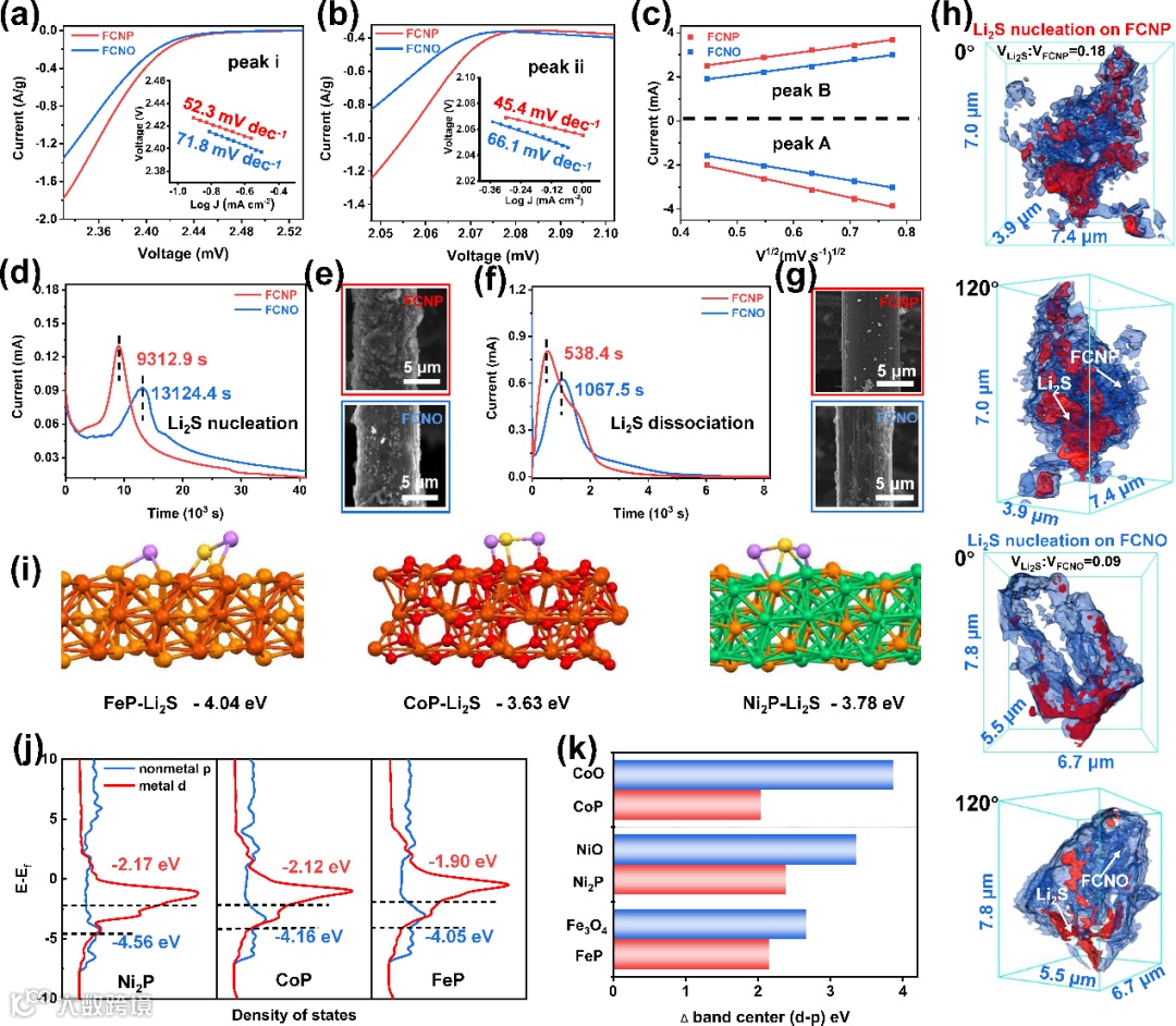 Fig. 2. Sulfur redox reaction detections. (a, b) Potentiostatic polarization curves from the LSV measurements with the derived Tafel plots as insets. (c) Linear fitting of peak currents versus square root scan rate of the S/FCNP and S/FCNO cathodes. (d) Potentiostatic discharge profiles of Li2S8/tetraglyme solution on CP-FCNP, CP-FCNO at 2.05 V. (e) SEM images of electrochemically precipitated Li2S on CP-FCNP and CP-FCNO. (f) The dissociation curves of Li2S on CP-FCNP, CP-FCNO. (g) SEM images of electrochemically dissociated Li2S. (h) Synchrotron X-ray 3D Nano-CT images with respect to Li2S deposits on CP-FCNP and CP-FCNO substrates according to various rotation angles. (i) The optimized adsorption geometries of Li2S on metal phosphide components. (j) Density of states of metal phosphides. (k) Band gap of metallic 3d band and nonmetallic 2p band.