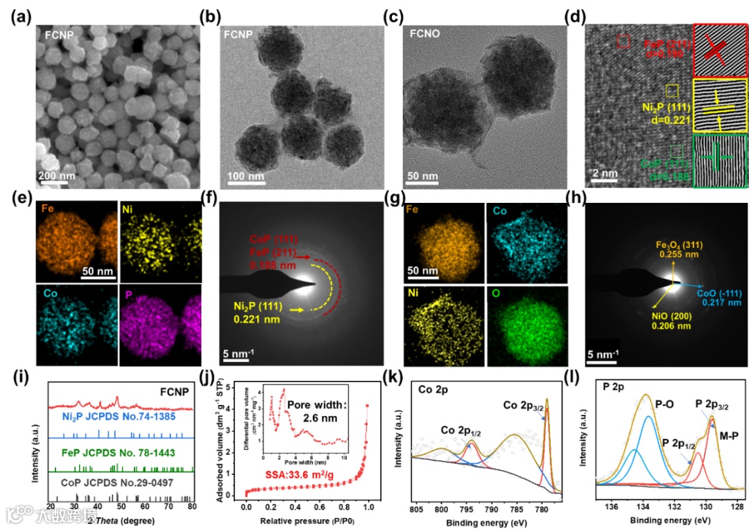 Fig. 1. (a) SEM image of FCNP. (b, c) TEM images of FCNP and FCNO. (d) HRTEM image of FCNP. (e) Elemental map image of FCNP. (f) SEAD image of FCNP. (g) Elemental map image of FCNO. (h) SEAD image of FCNO. (i) XRD pattern of FCNP. (j) SSA and pore size of FCNP. (k, l) XPS spectra of FCNP.