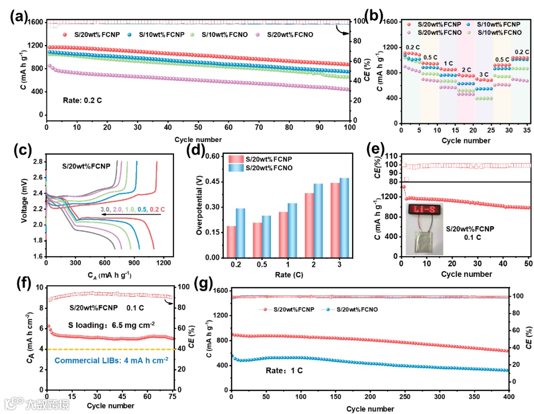 分别以10wt%和20wt%含量的FCNP和FCNO为电催化剂进行锂硫电池性能测试。与S/FCNO相比,S/FCNP具有更优异的倍率和循环性能。其中,S/20wt%FCNP在0.2 C倍率下,放电比容量可达1172.3 mA h g–1;在高硫负载(6.5 mg cm–2)和低电解液用量(5.0 μL mgS–1)的情况下,S/20wt%FCNP在0.1C下的面容量可达.6.2 mA h cm–2,稳定循环75圈容量仍有5.0 mA h cm–2;同时,软包电池在0. 1C下容量可达1164.0 mA h g–1。