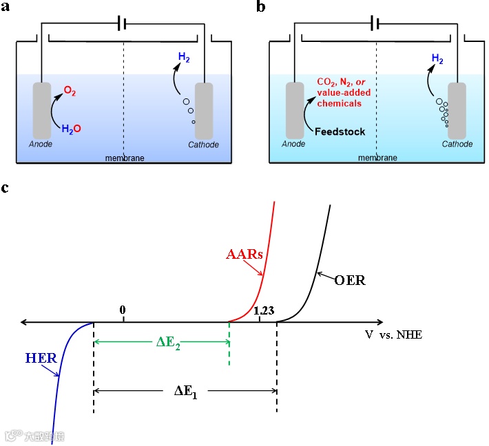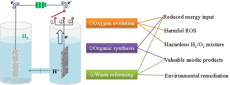 混合水分解(Hybrid Water Electrolysis)即利用热力学/经济上更加有利的氧化反应代替阳极OER与阴极HER匹配、耦合,不仅可以显著降低制氢能耗与成本,而且氧化电势的效用得到大幅提高,OER副反应受到完全抑制,能够制备高值氧化产物、降解或重整有害污染物等,使投资回报最大化。