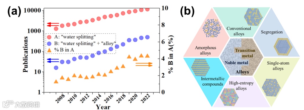 图2. (a)根据Web of Science,关于(A)水分解和(B)合金催化剂的研究文章数量。A中的%B表示在有关水分解的研究文章中含有合金催化剂的百分比。(b)合金催化剂的分类。