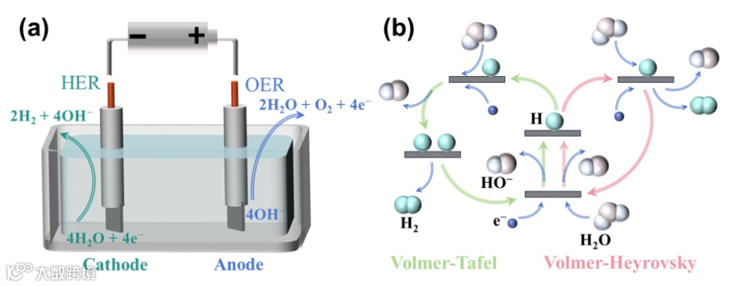图3. (a)碱水分解电解池示意图。(a)碱性HER机制。