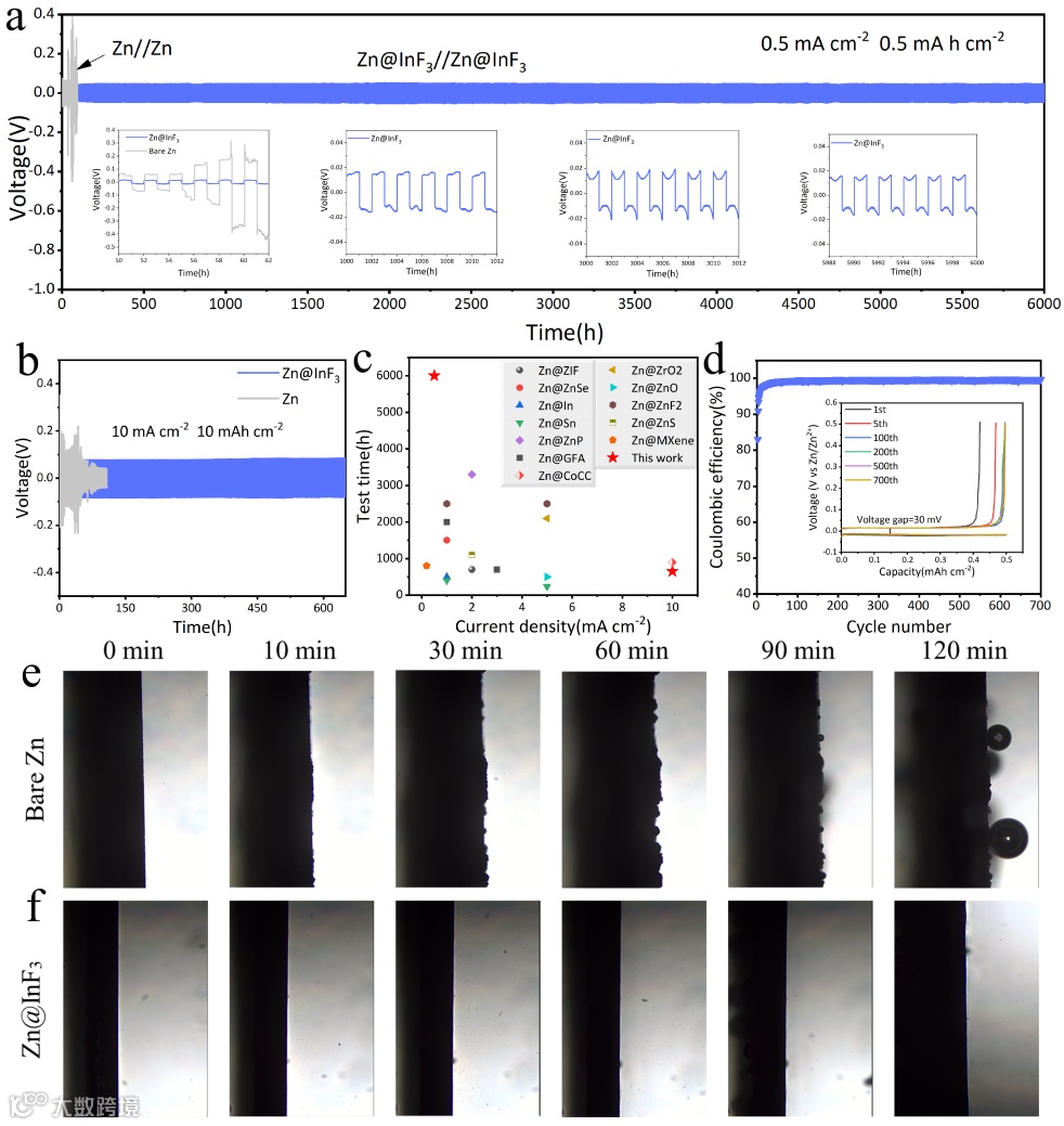 在 2 M ZnSO4 电解质中,对具有不同电流密度的 Zn//Zn 和 Zn@InF3//Zn@InF3 对称电池进行了恒流测试。Zn@InF3//Zn@InF3在 0.5 mA cm-2 的电流密度,面容量为 0.5 mA h cm-2 时,对称电池循环达到 6000 h,极化没有明显增加。优异的可逆性和循环寿命显着优于枝晶预防导向和析氢抑制设计的所有同类产品。此外,在 10mA cm-2 的电流密度和 10 mA h cm-2 的面积容量下进行原位光学显微镜观察,以验证对锌枝晶和析氢反应的抑制。可以清楚地看到,Zn@InF3 电极,在 120 分钟内获得了均匀致密的 Zn 沉积物,且没有观察到气泡。
