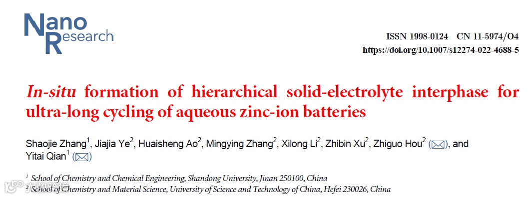 基于此,来自山东大学的钱逸泰院士与中国科学技术大学的侯之国副研究员合作,在国际知名期刊Nano Research上发表题为“In-situ formation of hierarchical solid-electrolyte interphase for ultra-long cycling of aqueous zinc-ion batteries”的研究文章。