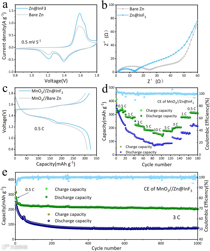 组装了MnO2//Zn和MnO2//Zn@InF3电池。在这里,选择厚度为10μm的锌板(阴极所需的过量量约为1.8倍,正负电极容量(N\/P)比为2.8)涂有InF3作为阳极。该负载代表了对锌阳极稳定性的严格测试,因为它需要高锌金属利用率和低寄生反应。在3 C电流密度下,MnO2//Zn@InF3电池的第一次循环放电比容量达到252.2 mAh g-1,1000 次循环后的容量为202.3 mA h g-1,容量保持率约为 80%。这表明InF3涂层可以有效抑制副反应,且Zn@InF3电极可以实现更高的容量和更长的循环寿命。