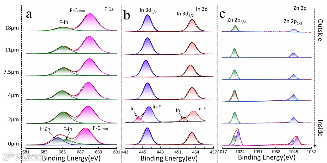 采用机械抛光的方法对静置后的Zn@InF3阳极进行抛光处理,以获得不同厚度的涂层,然后对其进行 XPS 测试。XPS光谱显示了Zn@InF3电极中Zn 2p、In 3d和F 1s的主要元素信号。当涂层厚度仅为 2 μm 时,在 In 3d 的高分辨率光谱中发现In金属的In 3d5/2 和 In 3d3/2 峰;在 0 μm位置时,在Zn 2p 的高分辨率光谱中,检测到ZnF2的 Zn-F 峰。进一步证明了,在极片静置过程中就自发的形成了InF3|InF3-In|ZnF2分级SEI保护层。