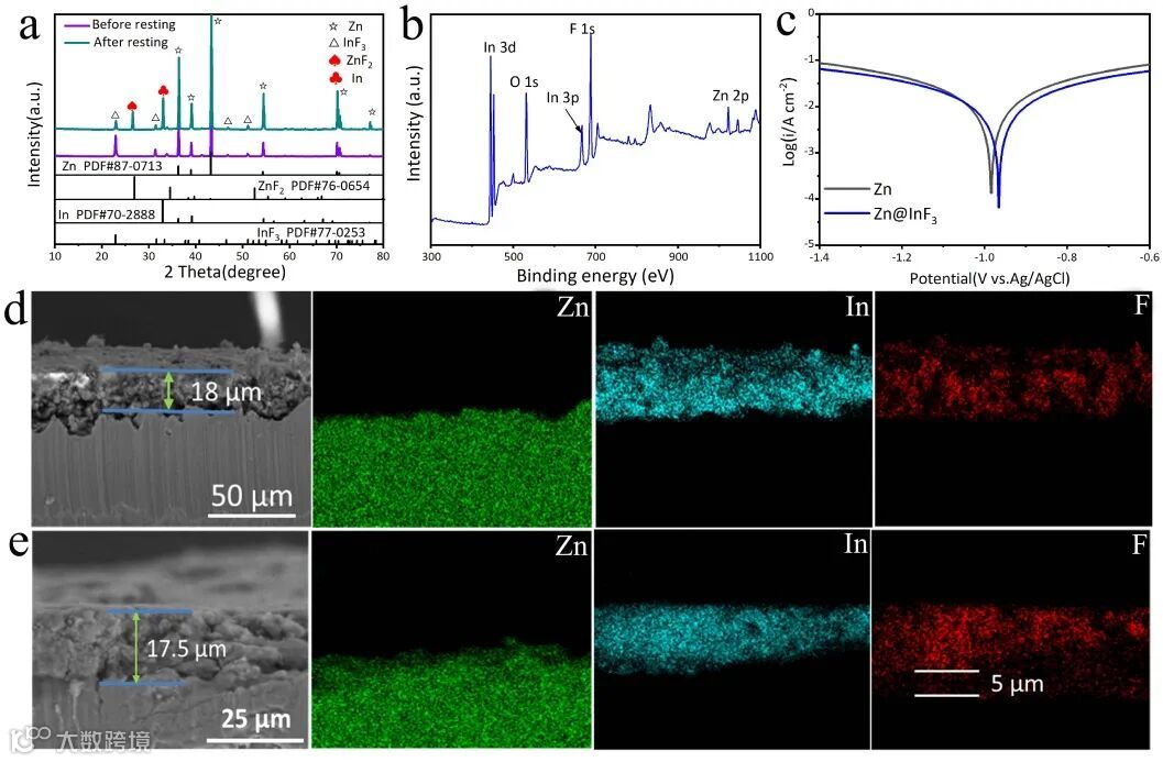 与静置前相比,静置后Zn@InF3电极的XRD图谱出现明显的In(PDF#70-2888)和ZnF2(PDF#76-0654)的特征峰。除此之外,从 SEM 图像可以看出,在镀层和锌之间形成了约5μm的F层,证明静置时形成了ZnF2。