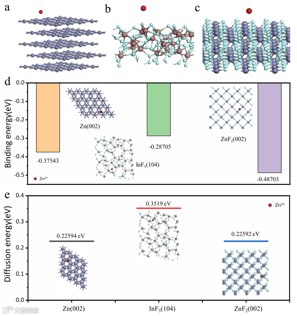 采用密度泛函理论 (DFT) 计算来研究涂层材料对涂层-电解质界面处离子转移动力学的影响。通过计算Zn2+与Zn(002)、InF3(104)和ZnF2(002)的结合能得出,Zn在ZnF2上的结合能为−0.48703 eV,相比裸锌上−0.37543 eV,以及在−InF3上为0.28705 eV,离子更容易被吸附到ZnF2表面。除此之外,计算了锌阳极、InF3和ZnF2中锌离子扩散所需的势垒。