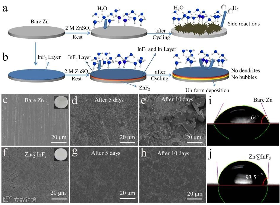 通过SEM观察,裸锌表面和Zn@InF3表面在2 M ZnSO4电解液中静置几天之前和之后,有涂层锌片的表面仍然平坦,变化不大。然而,对于裸锌,在电解液中浸泡5天后,可以清楚地看到形成了一些薄片,10天后,出现了许多薄片。且与纯锌箔相比,Zn@InF3极片和电解质之间的润湿性降低,这有助于隔离电解质中水分子的渗透性,并防止腐蚀钝化和析氢反应。