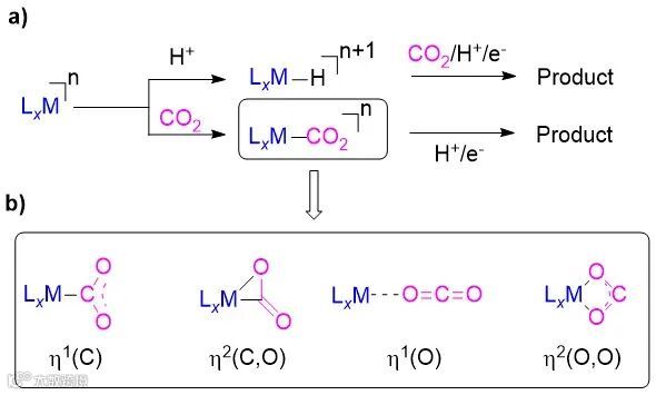 图2. a) 金属络合物催化剂对CO2活化作用;b) CO2与单金属中心的配位模式
