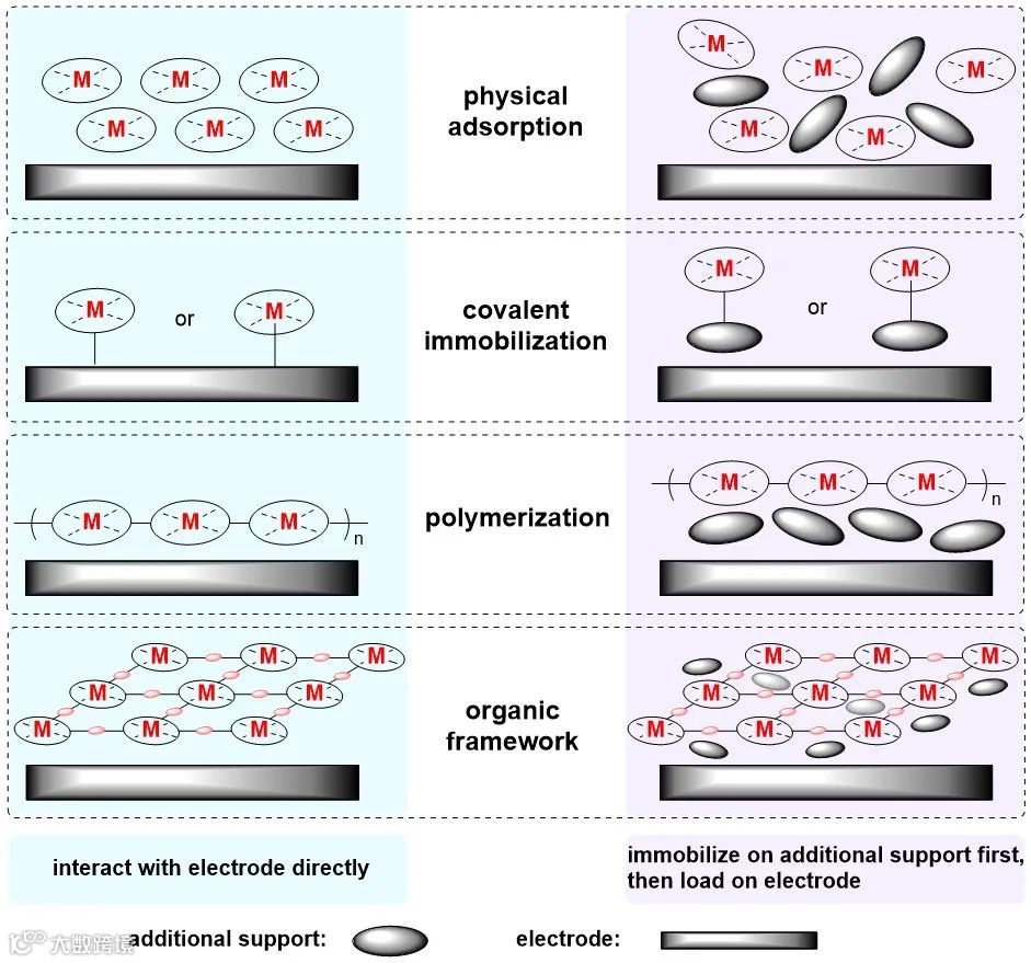 为了获得稳定、分子利用率高、比表面积大、电子转移快的多相分子基催化剂,需要精心设计合适的工程方法进行固载化。在这种情况下,化学家试图通过物理吸附或在催化剂和电极之间形成化学键来逐个固定分子。