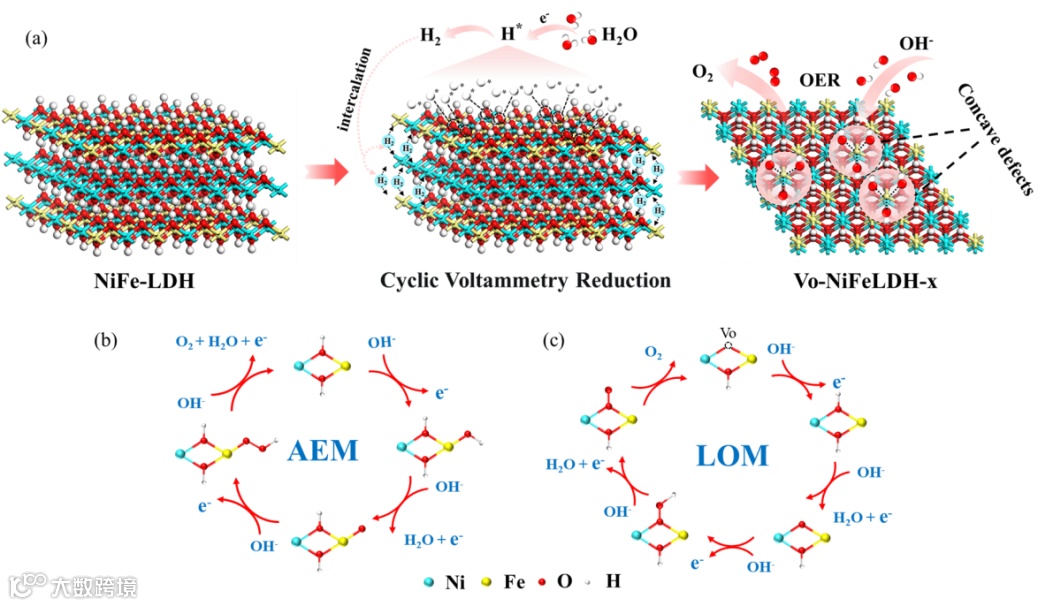 该论文证明循环伏安还原法是制备表面凹坑缺陷的NiFe-LDH纳米薄片的有效方法。电化学还原产生的活性氢可使NiFe-LDH中的部分晶格氧被还原产生氧空位,同时电化学还原产生的H2可使NiFe-LDH发生剥离。所获得的凹坑缺陷丰富的超薄3D纳米片具有丰富的活性位点、电子转移能力及良好的电导率,从而大幅提升NiFe-LDH对OER的催化活性。该项工作为纳米片的剥离及其表面缺陷的构建提供了一种普适方法。