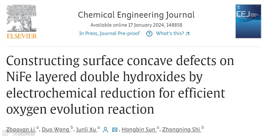 近日,来自东北大学的徐君莉教授,在国际知名期刊Chemical Engineering Journal上发表题为“Constructing surface concave defects on NiFe layered double hydroxides by electrochemical reduction for efficient oxygen evolution reaction”的文章。该文章利用水热与电化学还原相结合的方法,构建了具有丰富表面凹坑缺陷的超薄Vo-NiFeLDH-x纳米片用于高效催化析氧反应。