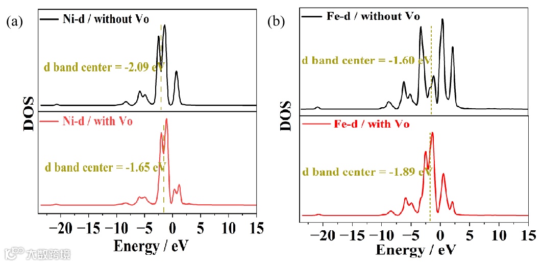 图3. 不含Vo和含Vo的Ni和Fe原子的态密度和d带中心