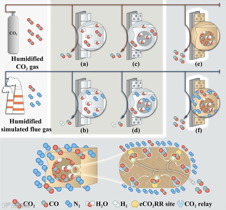 图 1.(a)在纯 CO2气氛下和(b)在模拟烟道气条件下,无孔催化剂颗粒表面的 eCO2RR;(c)在纯 CO2气氛下和(d)在模拟烟道气条件下,无 “二氧化碳中继器”的多孔催化剂颗粒表面的 eCO2RR;(e)在纯 CO2气氛下和(f)在模拟烟道气条件下,有“二氧化碳中继器”的多孔催化剂利用其微孔捕获CO2并同时进行电还原。