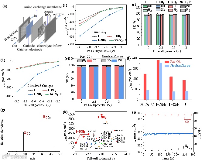 在模拟烟道气环境下,1−NH2表现出显著的电催化性能,在−2.3 V的电极电压下,CO的法拉第效率为96%且电流密度高达120 mA cm-2,全电池能量转换效率为56%,在持续工作 300小时后,选择性和电流密度保持在同一水平。值得一提的是,1−NH2的电催化性能在模拟烟道气环境与100% CO2环境下的性能接近,并且高于所有已报道催化剂在100% CO2环境下的较高电位下的性能。