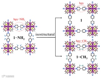 目前报道的eCO2RR 通常在液相电解液条件下进行,一方面CO2O2在电解液中的溶解度通常非常有限,另一方面催化剂的孔隙会被电解液填充,导致反应发生在催化剂的颗粒表面,从而限制了催化效率(图1a和1b)。值得注意的是,并非所有多孔催化剂都能在模拟烟气条件下(CO2/N2 = 15:85,湿度为 40~80%)有效捕集和富集CO2,因为与H2O 分子的竞争性和较强的亲和力相比,多孔催化剂的吸附位点通常对二氧化碳的亲和力较弱。因此,即使在气固反应器中,eCO2RR仍主要发生在多孔催化剂的颗粒表面,而不是颗粒内部的孔隙表面(图1c和1d)。在这种情况下,多孔催化剂需要强大的二氧化碳捕获位点作为“二氧化碳中继器”,以捕获和富集孔隙中的CO2分子,然后将其迁移到催化位点进行 eCO2RR(图1e和1f)。因此需要开发集二氧化碳捕集位点和电化学催化活性位点于一体的多孔催化剂,从而实现对烟道气中的CO2的高效率电还原转化。本文将Ag12团簇和”CO2中继站”整合在一个金属有机框架中(1−NH2),以期实现在模拟烟道气中(CO2:N2 = 15:85,298 K)高效捕集二氧化碳,并通过eCO2RR催化吸附的CO2转化为CO。