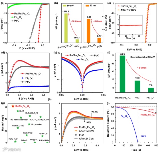 图3. Ru/RuxFe3-xO4及相关催化剂的HER/HOR性能测试。