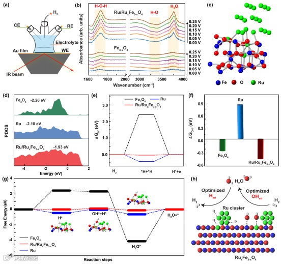 原位红外光谱测试表明:碱性环境中非特异性吸附的OH阴离子可能通过界面水层促进OHad生成,并且额外的自由水分子会作为质子供体积极参与表面催化。基于结构表征,构建了Ru/RuxFe3-xO4异质结构计算模型。根据计算结果显示,OHad对碱性HOR的动力学增强起着重要作用,相比于Fe3O4和Ru,OH在Ru/RuxFe3-xO4上的吸附能显著增强。此外,Ru原子向FeOx界面分散导致电子重排,有效调节了表面活性位点H和OH的吸附能,从而降低了HO形成的关键反应能垒,促进了HER/HOR反应。