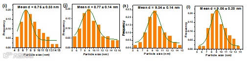 图7. (a, e, i) TP-BPN COF, (b, f, j) TP-PN COF, (c, g, k) TP-BPyN COF, 和(d, h, l) TP-BPyN PCOF在12 wt% Pt(投加量)和10 vol% TEOA光催化HER反应6 h后的TEM, HRTEM图像和Pt纳米粒度分布。