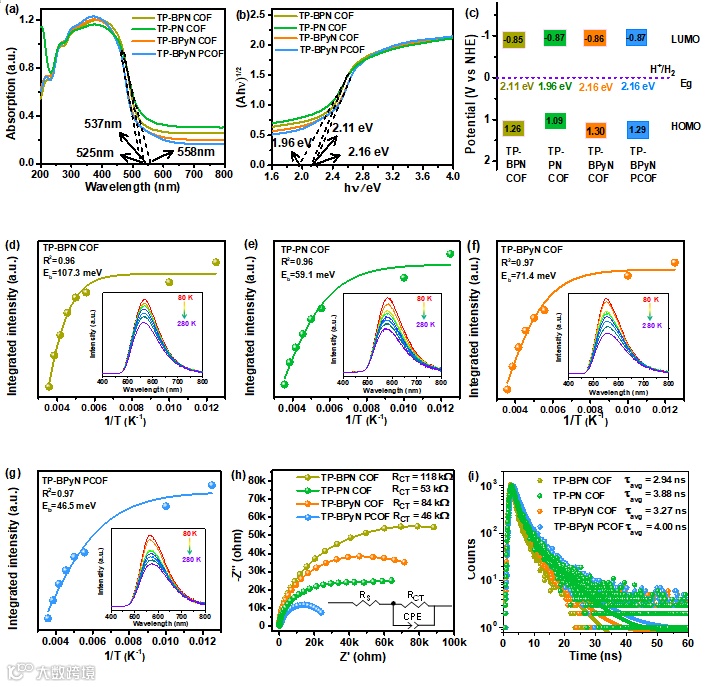 图4. COFs的 (a) 紫外可见漫反射光谱,(b) Tauc图,和(c) 带结构图。(d) TP-BPN COF,(e) TP-PN COF,(f) TP-BPyN COF和(g) TP-BPyN PCOF的综合PL强度与温度的函数关系(插入与温度相关的80~280 K的PL光谱)。(h) Nyquist图和(i)时间分辨荧光(TRFS)光谱。