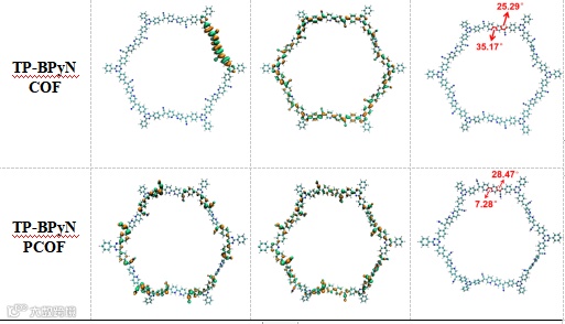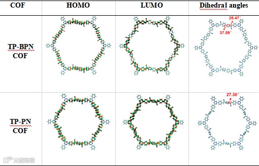 图6. COFs的HOMO、LUMO和二面角计算。(青色、蓝色和白色原子分别代表碳原子、氮原子和氢原子。)