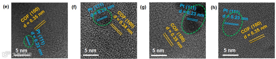 利用TEM图像观察了COFs上Pt负载情况(图7),相对于TP-BPN COF,TP-PN COF 的铂分布密度略高。TP-BPyN COF 的Pt纳米粒子分布密度明显更高。这表明通过缩短连接体长度和引入氮原子使激子解离后,更多的自由电子可以转移到 COF 表面进行还原反应,形成更致密的铂沉积。此外,与 TP-BPyN COF 上铂纳米粒子的部分聚集(d = 9.34 nm,图 7c,k)相比,TP-BPyN PCOF 的分布更为均匀(d = 9.05 nm,图 7d,l)。这表明,后质子化可以进一步改善激子解离,从而更有利于铂负载和析氢反应。