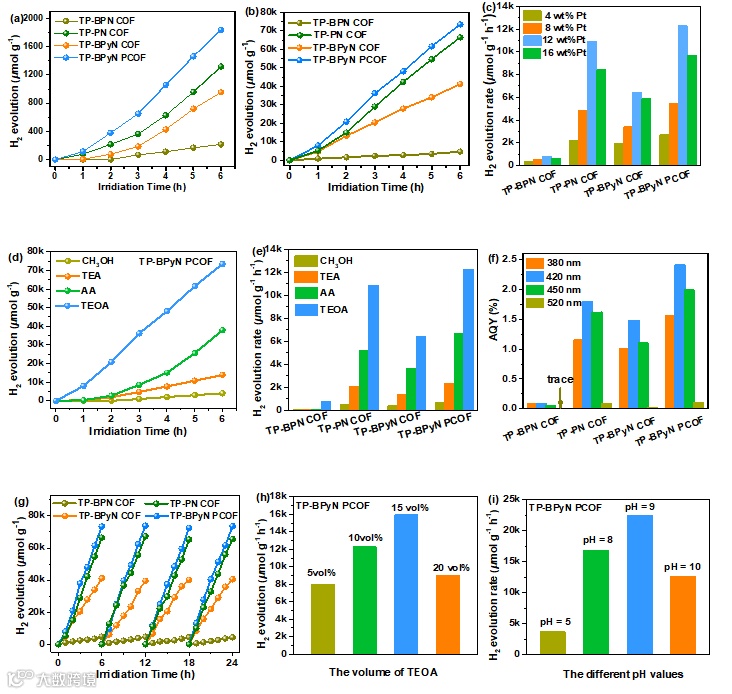 图5. (a)无助催化剂Pt时COFs的光催化析氢活性,(b)12 wt% Pt的最优投加量下COFs的光催化析氢活性,(c) 4、8、12和16 wt% Pt投加量下COFs的析氢速率。(d)不同牺牲剂对TP-BPyN PCOF光催化析氢活性的影响; (e)不同牺牲剂对COFs光催化析氢速率的影响。(f)不同波长下的表观量子效率(AQE),(g) COFs的循环稳定性。(h)不同TEOA体积分数和(i)不同pH值下TP-BPyN PCOF的HER率。