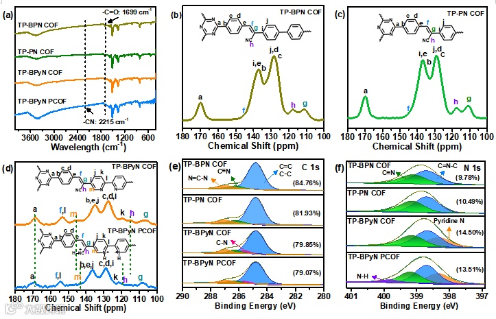 图3. (a) COFs的FT-IR光谱。(b) TP-BPN COF, (c) TP-PN COF, (d,上)TP-BPyN COF, (d,下)TP-BpyN PCOF的 13C CP/MAS NMR图谱。COFs的 (e) C 1s和(f) N 1s 的高分辨XPS光谱。(e)和(f)中的数字分别是COFs中碳和氮的原子百分比。