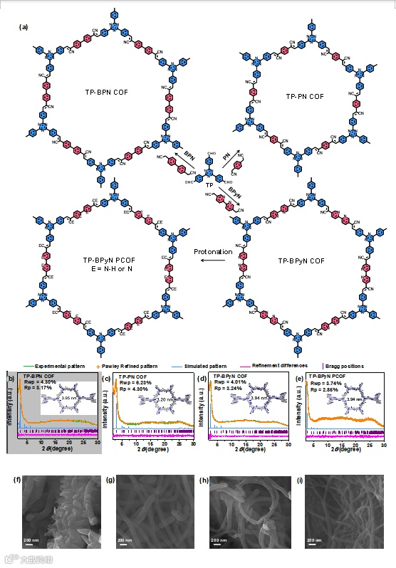图 2.(a)COFs 的化学结构和合成策略;(b-e)不同 COFs 的实验和模拟粉末 X 射线衍射图样;(f)TP-BPN COF,(g)TP-PN COF,(h)TP-BPyN COF 和(i)TP-BPyN PCOF 的扫描电子显微镜图像。