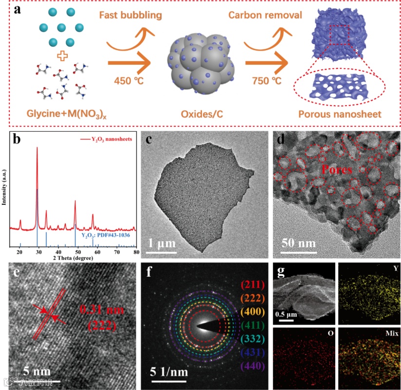 如图1a示意图,利用甘氨酸高温下快速膨胀形成气泡的特点,将甘氨酸作为前驱体添加剂,通过调控预热温度和热处理时间,实现了高质量MMONs的一步快速制备。XRD图谱(图1b)、低倍TEM明场像(图1c-d)和高分辨透射电镜HRTEM(图1e)和选区电子衍射SAED(图1f)分析结果表明,该方法合成的Y2O3产物是结晶性好、拥有大量孔隙的超薄纳米片,孔径分布在5~10 nm,比表面积高达32.8 m2 g-1,各元素分布均匀,无其它杂相存在,如图1g所示。