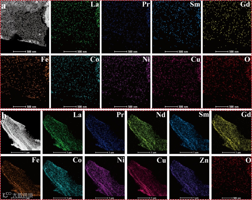 图3. 利用该方法制备的(a) La0.4Pr0.2Sm0.2Gd0.2Fe0.4Co0.2Ni0.2Cu0.2O3 (HEO-8)和(b) La0.2Pr0.2Nd0.2Sm0.2Gd0.2-Fe0.2Co0.2Ni0.2Cu0.2Zn0.2O3 (HEO-10)的HAADF-STEM图像以及相应的元素分布图。