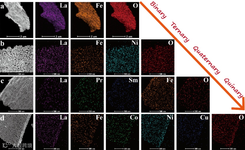 特别是,该制备方法能够拓展合成含有多达10种金属阳离子的单相高熵MMONs(氧化物中金属元素的种类精准可调控,从单金属氧化物到多金属氧化物),无需任何分离纯化步骤。以LaFeO3为例,图2所示,分别对La位点或Fe位点取代,获得了多金属氧化物MMONs,HAADF-STEM图像和元素分布分析结果表明,五元金属高熵氧化物HEO-5被成功制得。