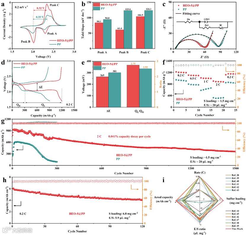 图4. (a, b) 不同电池的CV曲线和相应的Tafel斜率。(c)不同电池循环前的EIS曲线。(d, e) 0.2 C下测试的GCD曲线和相应的ΔE及QL/QH数值。(f, g)不同电池的倍率性能和长循环性能。(h, i)基于HEO-5@PP隔膜的Li-S电池在高硫负载下的充放电循环性能及相应性能的对比图。