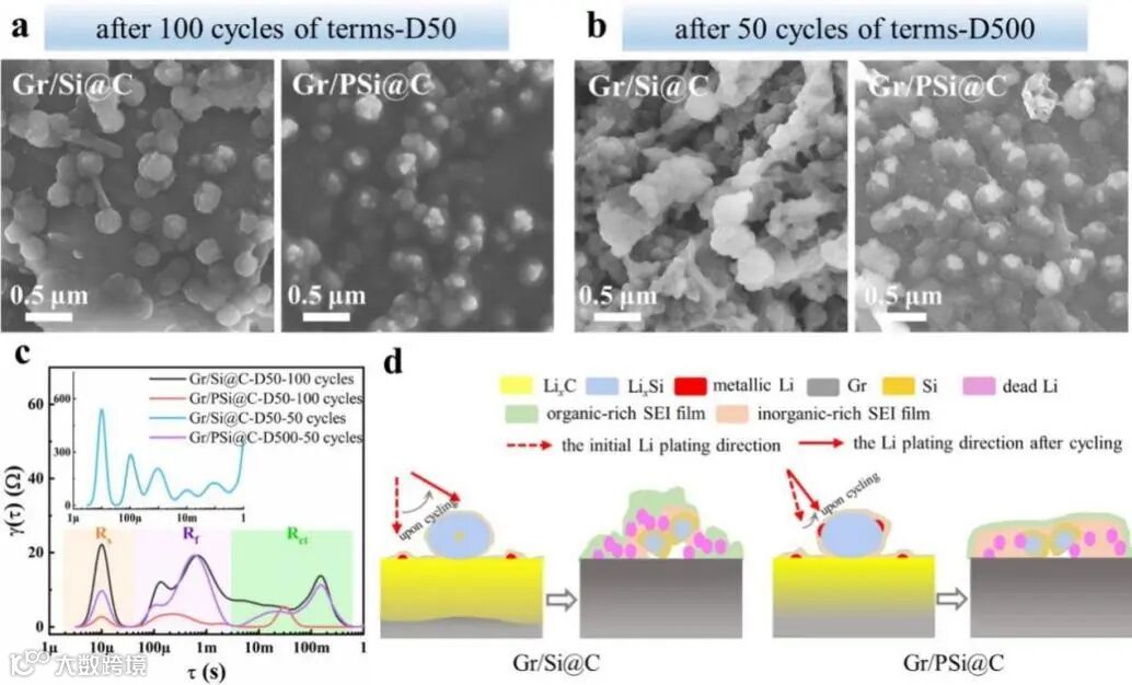 图2. 硅/石墨复合负极析锂后的电极形貌、DRT分析和机制示意图