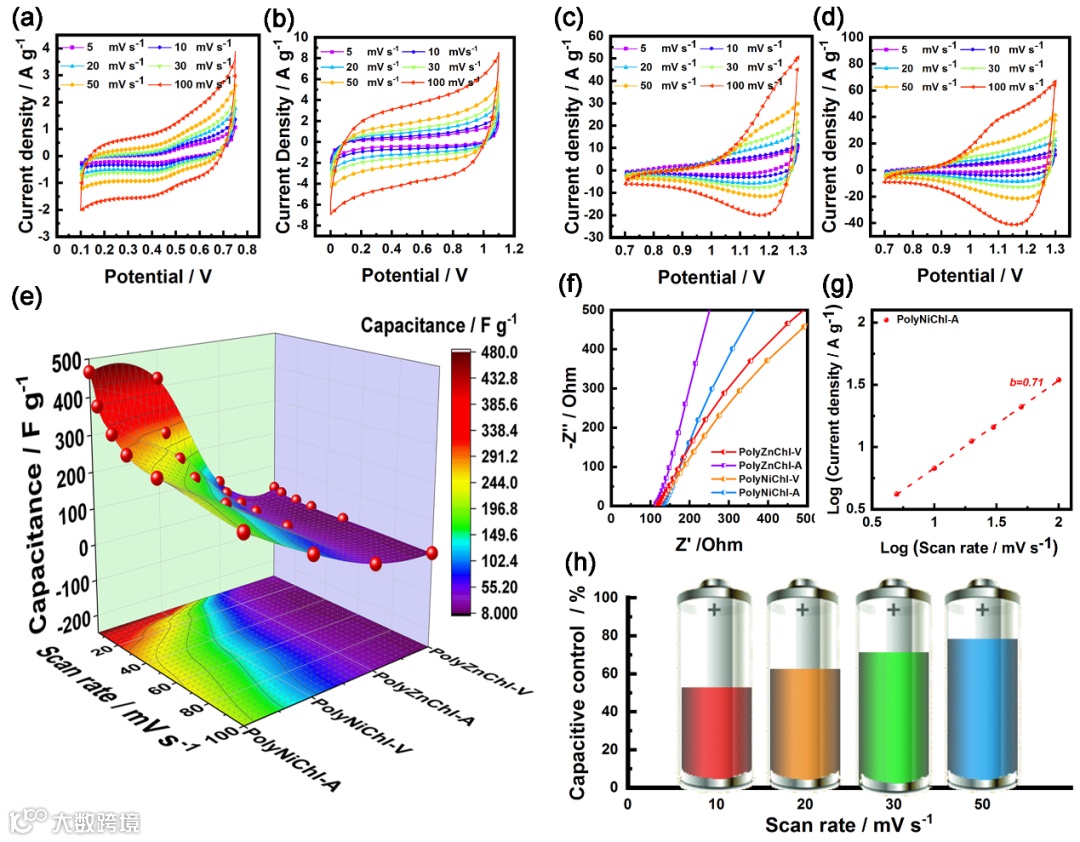 图4.(a)PolyZnChl-E,(b)PolyZnChl-A,(c)PolyNiChl-E,(d)PolyNiChl-A 的循环伏安曲线。(e)四种聚合叶绿素薄膜的在不同扫描速率下的质量比电容。(f)四种聚合叶绿素薄膜的交流阻抗谱。(g)PolyNiChl-A薄膜在1.1 V时电流密度和扫描速率的函数关系。(h)PolyNiChl-A薄膜在不同扫描速率下的电容贡献占比。