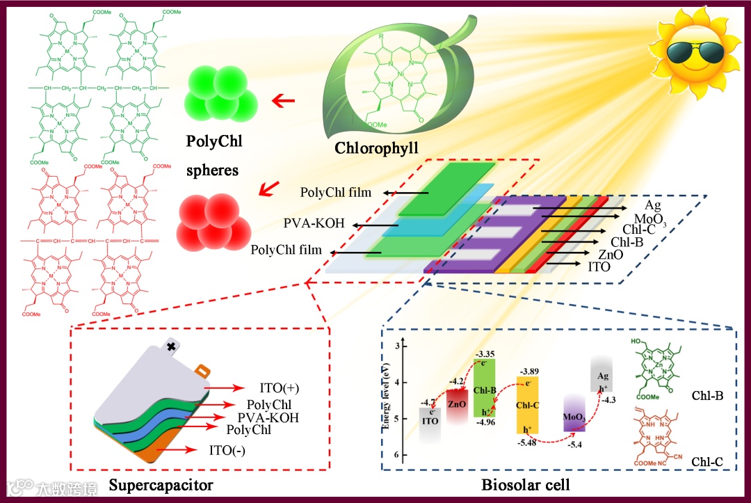 该文章首次将电化学合成了聚合叶绿素薄膜,将其应用为超级电容器电极材料。此外,还利用叶绿素聚合物组成固态对称超级电容器,同叶绿素基的生物太阳能电池共电极的方法组装到一起,成为一个可以稳定在不同光照条件下工作的光电转换存储一体化器件(如图1),为将来清洁能源体系的构建提出了一条新思路。不饱和乙炔基叶绿素的聚合,同样扩充了叶绿素有机物聚合物家族,证实了其发展的巨大潜力。