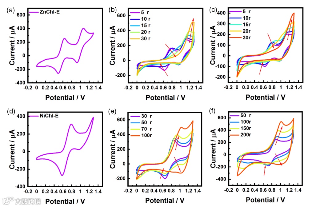 图3.(a)ZnChl-E,(b)ZnChl-V,(c)ZnChl-A,(d)NiChl-E,(e)NiChl-V,(f)NiChl-A在动电位循环过程中的伏安曲线。