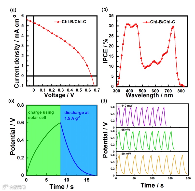 图5. 叶绿素基太阳能电池的(a)J-V曲线,(b)IPCE曲线。(c)叶绿素基能量转换储存器件的光充曲线,放电电流密度为1.5 A g-1。(d)不同光照强度下的叶绿素基能量转换存储器件的光充曲线。