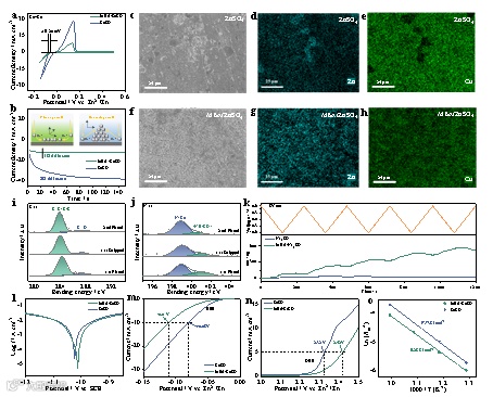 图 3 a) ZnSO4和MBA/ZnSO4电解液在扫描速率为5 mV s−1时Zn//Cu不对称电池的CV曲线;b) ZnSO4和MBA/ZnSO4电解质中Zn//Zn对称电池的计时电流曲线(附图:ZnSO4和MBA/ZnSO4电解质中Zn沉积行为示意图); c-h) 在ZnSO4和MBA/ZnSO4电解质中,以1 mA cm−2电流密度测试200 s后的Cu箔的SEM图像和EDS图; i-j) 锌负极初始电镀、剥离和二次电镀状态下的C 1s和N 1s的XPS光谱; k) 5个循环CV测试过程中EQCM的质量变化; l) ZnSO4和MBA/ZnSO4电解质中Zn负极的Tafel图; m-n) ZnSO4和MBA/ZnSO4电解质的LSV曲线; o) 基于Arrhenius公式计算Zn//Zn对称电池的脱溶剂能。